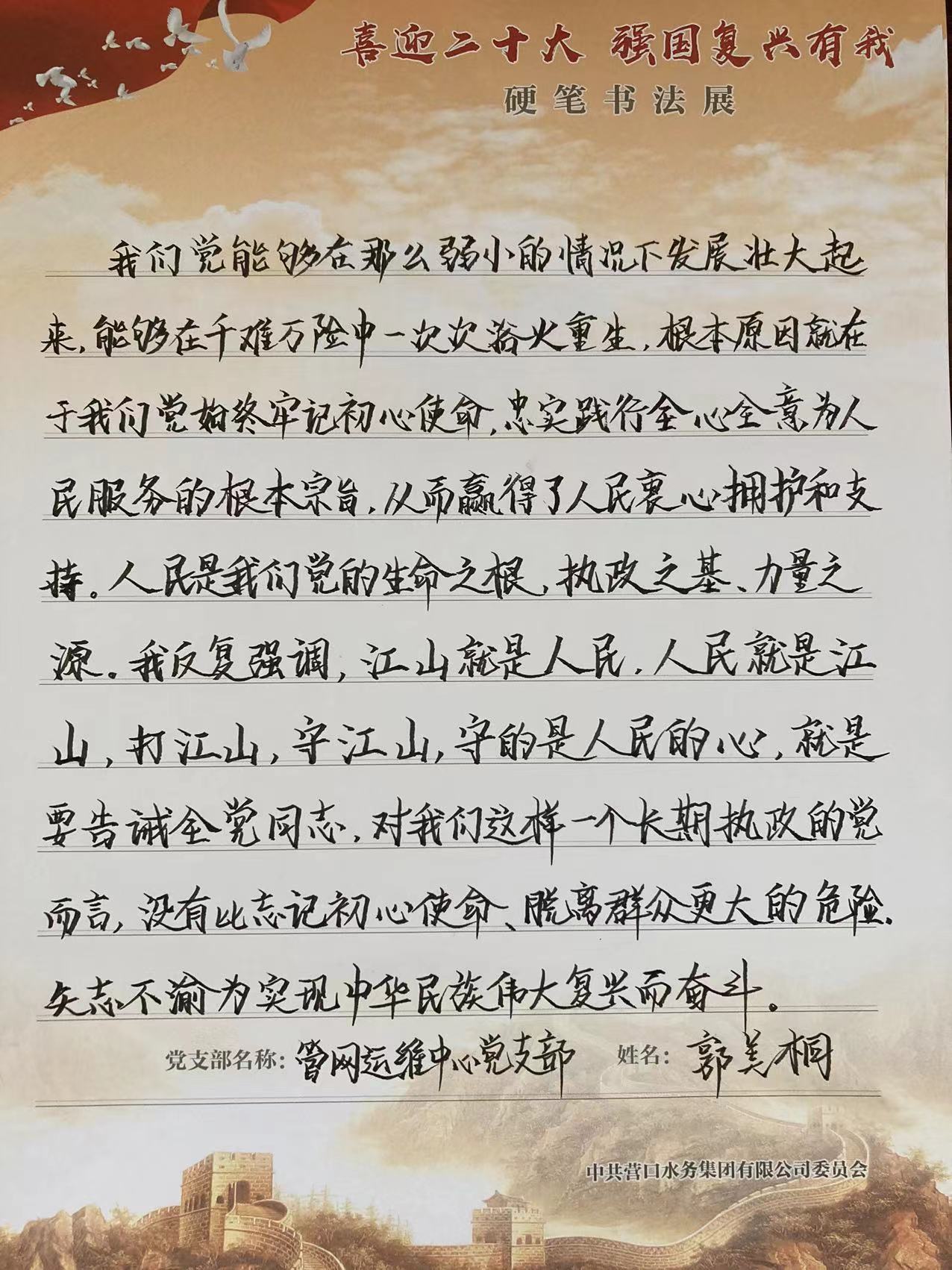 通過此次硬筆書法展,集團員工深刻領(lǐng)會《習(xí)近平談治國理政》第四卷的核心要義,在工作中增強“干”的定力、“會”的本領(lǐng)、“實”的作風(fēng),積極推動相關(guān)政策舉措落地生根,真正把學(xué)習(xí)成效體現(xiàn)在供水安全、運行效能、優(yōu)化營商環(huán)境的精彩答卷上,以更加主動的精神狀態(tài)、更加昂揚的奮斗姿態(tài)迎接黨的二十大勝利召開。