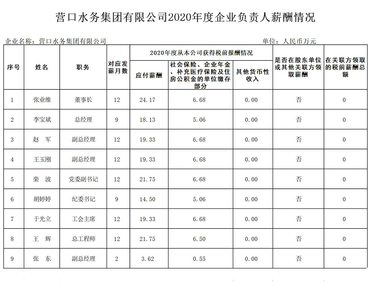 2020年度營口市市屬企業(yè)負責人薪酬信息公開表